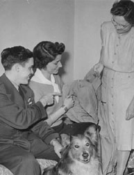While being treated for the wound he received at the Battle of the Santa Cruz Islands, Clayton Fisher was able to spend Christmas 1942 with his wife and family in Janesville, Wisconsin. He is shown here with his wife Anne, his mother, and his dog Peter. The photograph was taken by a local newspaper photographer for a story. Anne is showing the shrapnel holes in the right arm of Clay's flight suit.