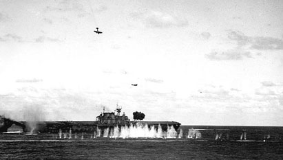 The USS Hornet is shown under attack at Santa Cruz by Japanese dive-bombers and torpedo planes. The Americans had a combat air patrol of 37 Wildcat fighters to defend Hornet, but inept fighter direction from the flagship USS Enterprise left Hornet dangerously exposed to the enemy air strike. A Japanese dive-bomber pilot is about to crash his aircraft into Hornet's island structure. A Kate torpedo bomber is passing above the carrier.