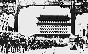 Having been barely touched by World War I, Japanese industry and trade had expanded dramatically during that war to fill the gap left by Europe's devastated industries. However, most of the raw materials needed to supply Japanese manufacturing industry had to be imported because Japan possessed inadequate natural resources. This problem was compounded by substantial population increase. Between 1918 and 1930, Japan's population had expanded dramatically and outstripped the capacity of the nation's resources to support it. To sustain its population blow-out, substantial food imports were essential, but foreign tariffs imposed on its exports of manufactured goods limited the capacity of Japan to pay for its food imports. Japan had tried to deal with its population problem by encouraging emigration of Japanese to countries such as the United States, but had met resistance from Americans who feared the loss of unskilled jobs to cheap immigrant labour.Invading Japanese troops enter China's ancient capital Peking in July, 1937. With a view to seizing the whole of China, Japan waged a brutal and unrelenting war against the Chinese until 1945. Millions of Chinese were killed.
