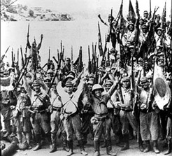 Singapore has fallen, and Britain has been humiliated. Victorious Japanese troops scream "Banzai!" These twentieth century barbarians slaughtered, raped, and looted their way across East Asia and the western half of the Pacific Ocean between 1937 and 1945. Including victims killed in China, historians estimate that the Japanese brutally murdered at least five million captive civilians and prisoners of war.