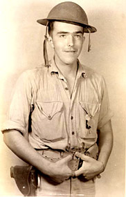 This photograph was taken at the time of Ed Fox's arrival on Midway with the Sixth Defense Battalion in January 1942. He is wearing a World War I model steel helmet. He trained with the .03 caliber 1903 Springfield rifle. During the months immediately following Pearl Harbor, much of the equipment used by American servicemen dated from World War I.